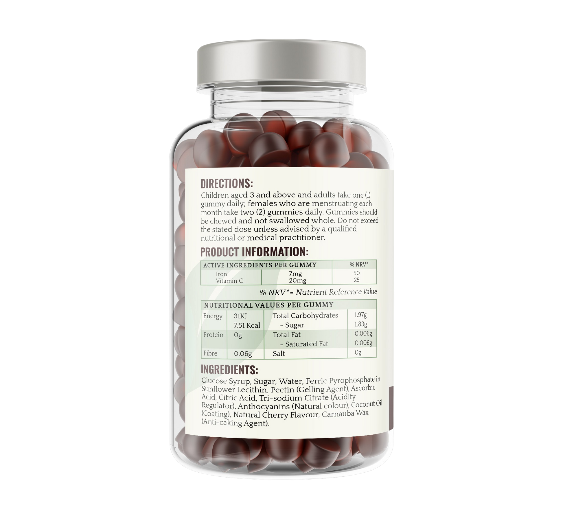 Product OverviewA delicious high-strength daily iron gummy supplement enhanced with vitamin C to support absorption. Suitable for children aged 3 and upwards, and an excellent supplement to support the whole family.EFSA Approved Health Claims for this product:- Iron contributes to the reduction of tiredness and fatigue.- Iron has a role in the process of cell division.- Iron contributes to normal cognitive function.- Iron contributes to normal formation of red blood cells and haemoglobin.- Iron contributes to normal energy-yielding metabolism.- Iron contributes to the normal function of the immune system.- Iron contributes to normal oxygen transport in the body.- Iron contributes to normal cognitive development of children.- Vitamin C contributes to normal energy-yielding metabolism.- Vitamin C contributes to normal collagen formation for the normal function of cartilage.- Vitamin C contributes to normal collagen formation for the normal function of gums.- Vitamin C contributes to the protection of cells from oxidative stress.- Vitamin C contributes to the regeneration of the reduced form of vitamin E.- Vitamin C contributes to maintain the normal function of the immune system during and after intense physical exercise.- Vitamin C contributes to the normal function of the immune system.- Vitamin C contributes to normal functioning of the nervous system.- Vitamin C contributes to normal collagen formation for the normal function of bones.- Vitamin C contributes to normal collagen formation for the normal function of teeth.- Vitamin C contributes to normal psychological function.- Vitamin C contributes to normal collagen formation for the normal function of skin.- Vitamin C contributes to normal collagen formation for the normal function of blood vessels.- Vitamin C increases iron absorption.- Vitamin C contributes to the reduction of tiredness and fatigue.This product does not contain Allergens according to Regulation EC No 1169/2011, including:• Gluten (wheat, rye, barley, oats, spelt, kamut or their hybridized strains)• Milk and products thereof• Soybeans and products thereof• YeastFree from Artificial Colours, Flavours, Sweeteners and Preservatives. Free from GMOs.SUITABLE FOR VEGETARIANS &VEGANSFood Supplement60 Gummies