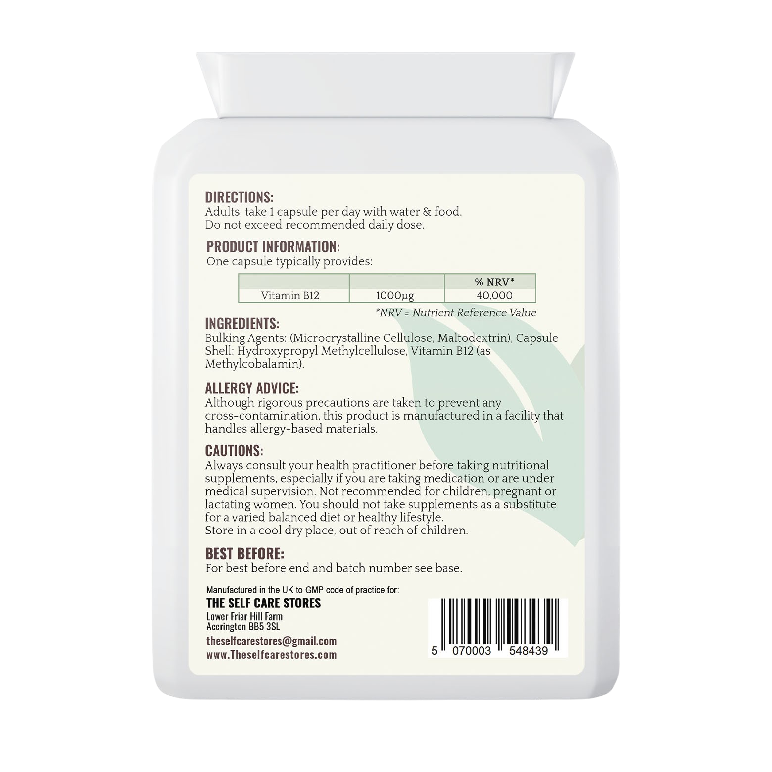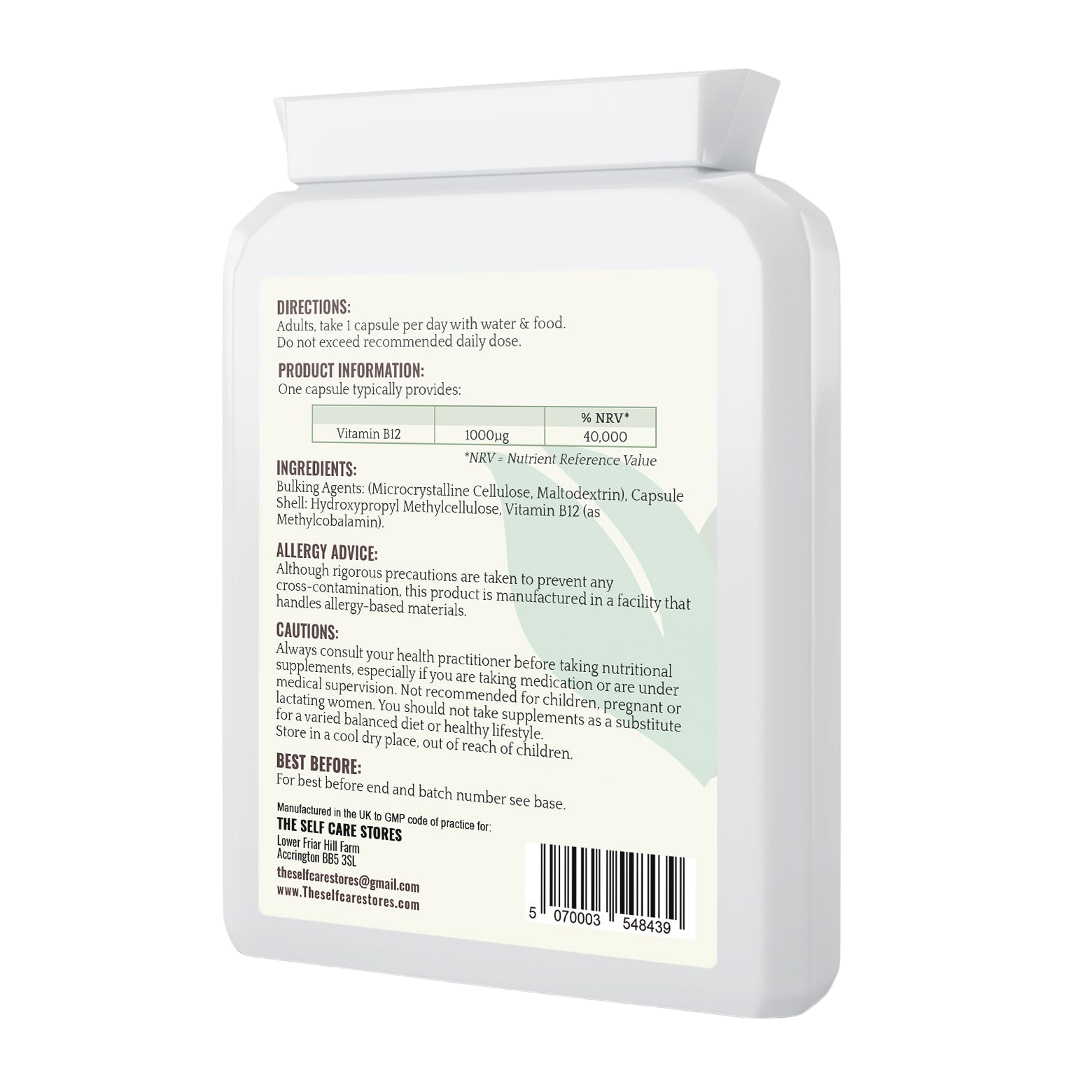 Some EFSA Approved Health Claims available:- Vitamin B12 contributes to normal energy-yielding metabolism- Vitamin B12 contributes to normal functioning of the nervous system- Vitamin B12 contributes to normal homocysteine metabolism- Vitamin B12 contributes to normal psychological function- Vitamin B12 contributes to normal red blood cell formation- Vitamin B12 contributes to the normal function of the immune system- Vitamin B12 contributes to the reduction of tiredness and fatigue- Vitamin B12 has a role in the process of cell division1000µg x 120 CapsulesFood SupplementSuitable for vegetarians and vegansManufactured in the UK to the GMP code of practice. These procedures ensure that the basic manufacturing practices and prerequisites necessary for product quality and safety are being followed so that we can guarantee you receive consistently high quality products.